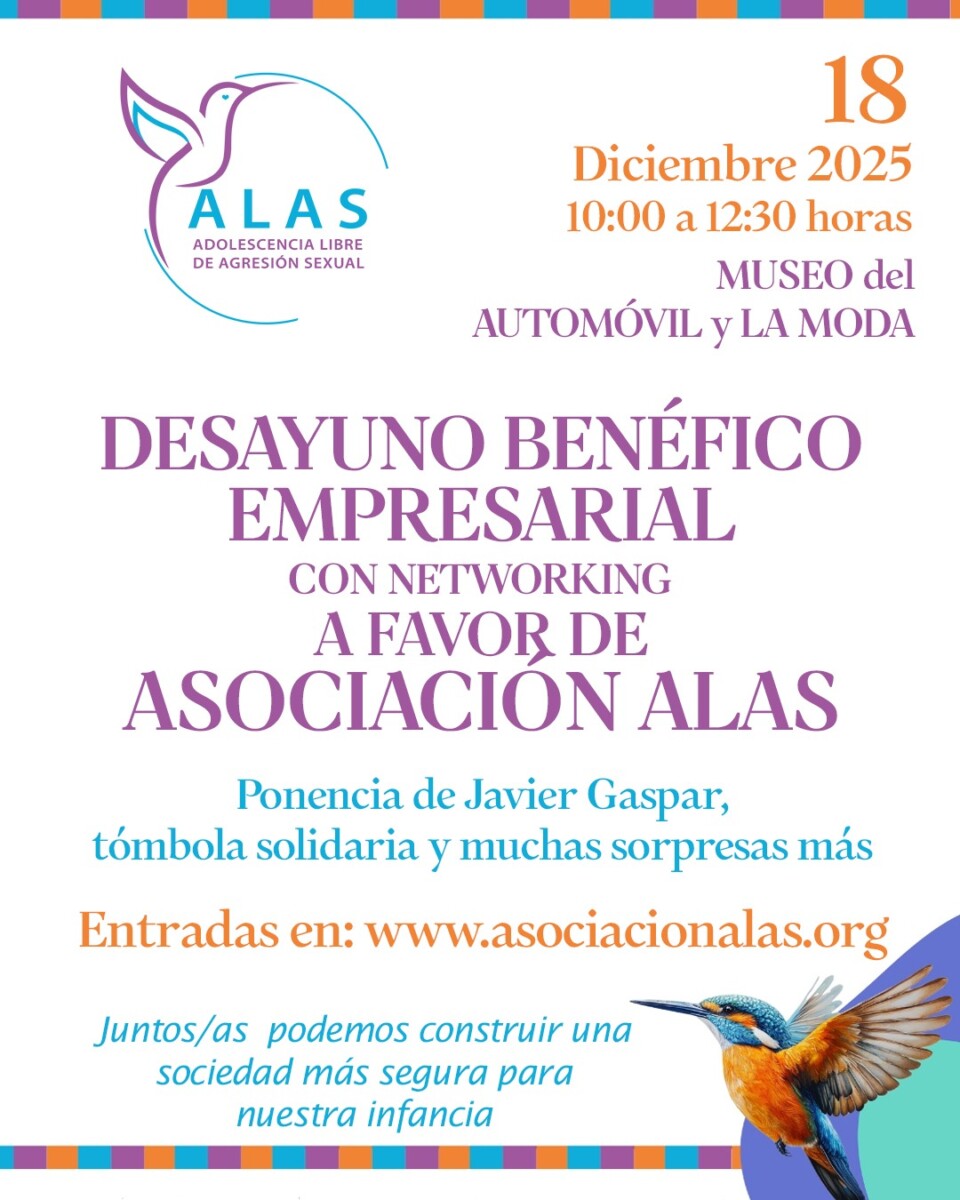 La Asociación ALAS (Adolescencia Libre de Agresión Sexual) organiza un Desayuno Benéfico Empresarial con networking, un encuentro diseñado para unir a profesionales, empresas y entidades comprometidas con la protección de la infancia y la adolescencia.